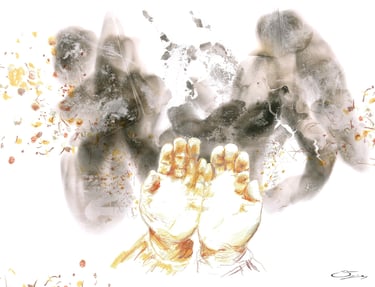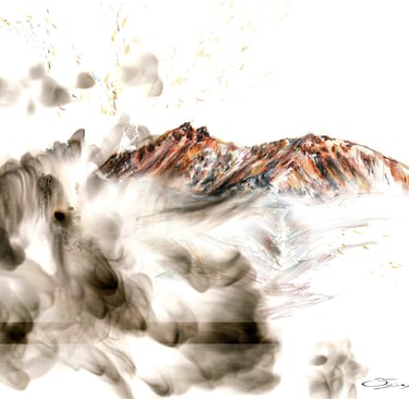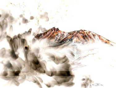 Depuis 2019, j'expérimente ma propre technique de création : la peinture à la flamme. A l'aide d'une bougie, le papier est brûlé en partie pour créer des motifs étonnants.